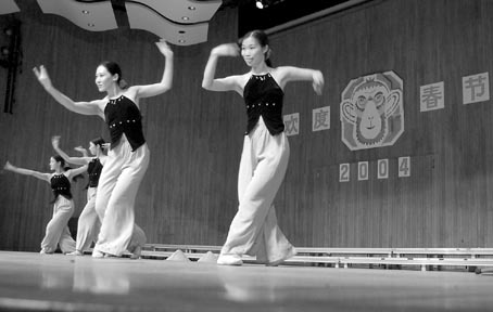 Dancers from the Yunnan Provincial Opera and Dance Theater of China perform in front of a sign bidding the audience a happy new year at the Chinese Students and Scholars Association’s 2004 Chinese New Year Celebration.