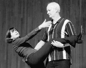 Colin Mochrie dips Jackie Harris in their “Film Styles” game, in which the duo performed in a variety of audience-suggested theatrical styles.