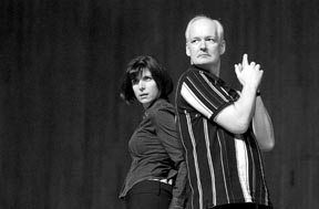 Jackie Harris and Colin Mochrie eye the crowd, “Charlie’s Angels”-style, in Sunday’s performance in Kresge Auditorium. Story and photos, page 8.