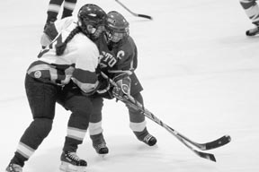 Co-captain Alicia Volpicelli '98 fights for the puck during Friday night's Women's Club Hockey's 3-0 loss against Boston University.