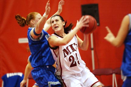 Andrea J. Dooley ’06 drives past a defender to sink a two-point shot during MIT’s 56-47 loss to Wheaton College Tuesday evening.