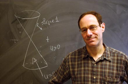 Professor of Mathematics David S. Jerison poses next to his schematic of a partial differential equation (PDE). One of his research interests is the geometric representation of PDEs.