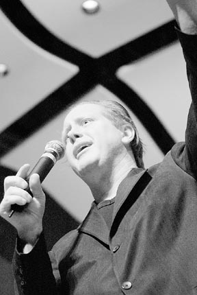 Darrell Hammond towers over the audience as he does a requested impression in the comedy show last Sunday in Kresge Auditorium.