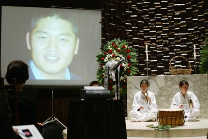 Members of Oori, MIT’s Korean drum group, perform as images of Mun are projected onto a screen. The drum placed in front of the performers was Mun’s instrument, and was left unplayed.