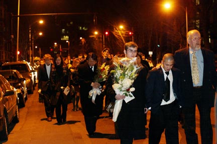 Mourners walk to the spot on the Harvard bridge where Mun’s body was recovered. The MIT Police temporarily halted traffic on the bridge in order to clear the way for the procession.