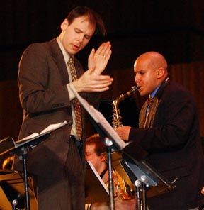 Frederick E. Harris Jr, the director of Wind Ensembles and Lecturer in Music, conducts the band as Alexander D. McMath ’07 solos on the alto saxophone in a piece titled “Diakalan.” Foreground is Michael I. Mandel ‘04 with the baritone saxophone.