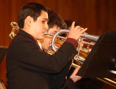 Jorge Padilla ’05 playing the flugel horn in a piece titled “Rocker” during the MIT Festival Jazz Ensemble concert at Kresge Auditorium last Saturday.