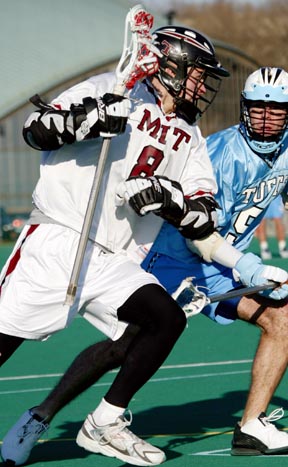 Thomas V. Hennessey III ’05 tries to swing around a Tufts opponent toward the net. Hennessey scored one goal and had an assist in the Engineers’