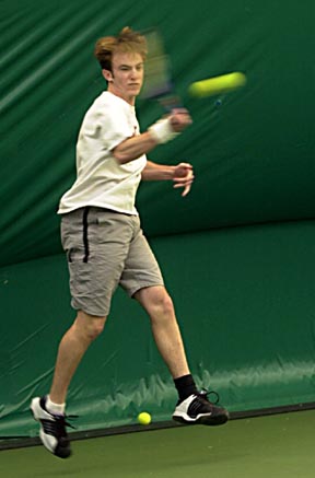 First doubles player Evan W. Tindell ’06 returns a serve in Saturday’s match against Bowdoin College. MIT lost the match to Bowdoin 5-2.