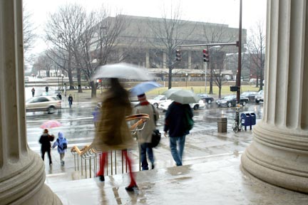 Students hurry through the heavy rain Wednesday afternoon at 77 Massachusetts Avenue. More rain is predicted through the beginning of next week.