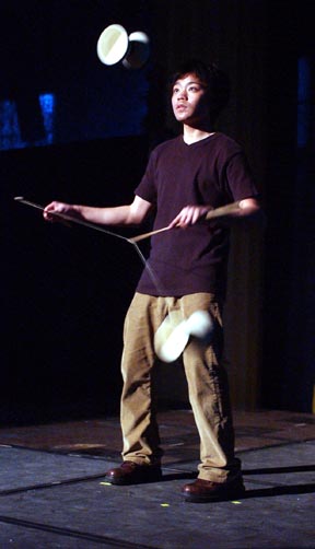 Boston University student Alan Batangan keeps two Chinese yo-yos (Tzuh-ling) in the air at once.