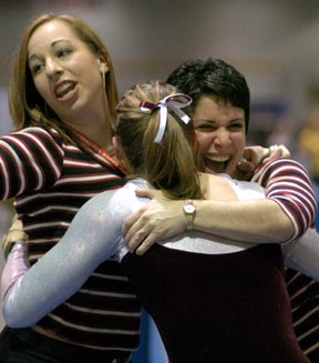 MIT assistant coaches Jackie Renoni, left, and Jennifer Miller-McEachern, right, congratulate Chandler E. Hatton ’06 after Hatton landed her vault last Friday.
