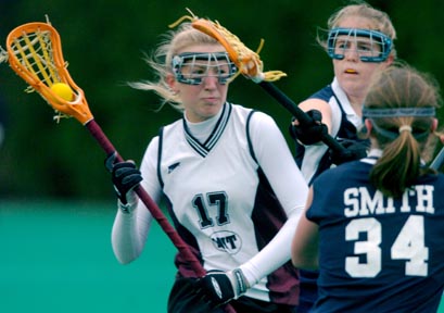 Midfielder Kelsey M. Presson ’05, left, prepares to shoot past two Smith College lacrosse defenders during MIT’s 13-4 victory on Saturday.