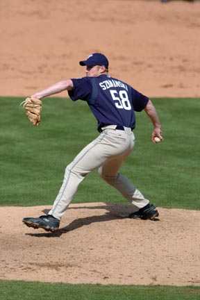 MIT Alum Jason E. Szuminski ’01 practices his pitch earlier this year during spring training with the San Diego Padres.