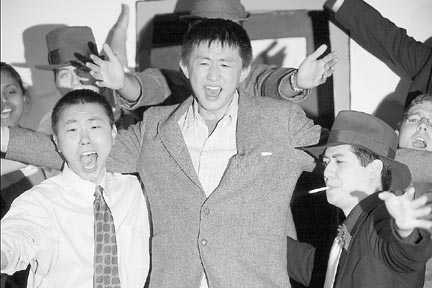 Gangsters Yufei Wang ’04 (left), Tony Wu ’06, and Paul A. Wanda ’04 sing together in the finale of Next House’s production of “Guys and Dolls.”