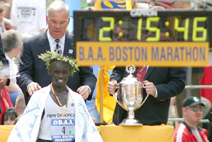 Boston mayor Thomas Menino crowns 2004 Boston Marathon men’s winner Timothy Cherigat atop the awards podium, Monday, April 19, 2004. Cherigat won the race with a time of 2:10:27.
