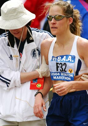 Shannon H. Hovey, 33, of Simsbury, CT, is helped away from the finish line of the 2004 Boston Marathon, Monday, April 19. Hovey placed 27th in the women's race.