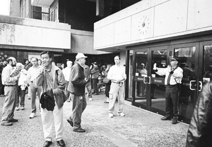 A police officer turns back people outside the Student Center yesterday. Concerns about the poorly lit corridors of the building led to its evacuation after the electricity failed.
