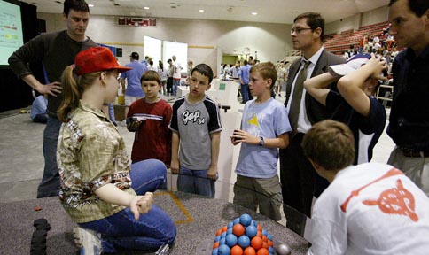 Competition staffer Christina M. Laskowski ’05 (left) explains the contest rules to a group of kids.