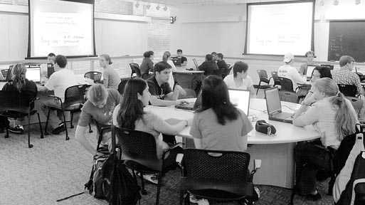 Students are welcomed to their first day of 8.01T in the Technology Enabled Active Learning room. See “8.01T Scheduled To Replace 8.01 in ’05” on page 9.