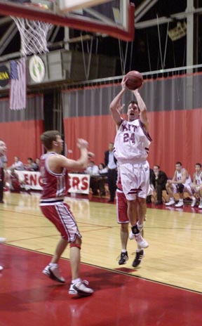 MIT forward Kyle T. Doherty ’04 goes up uncontested for two on a fast break. The Engineers defeated Clark University 74-65 in Tuesday night's game.