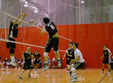 Javad Golji ’06 spikes the ball in a match against Johnson and Wales University. MIT caught up and won the match 3-1 after losing the first game.