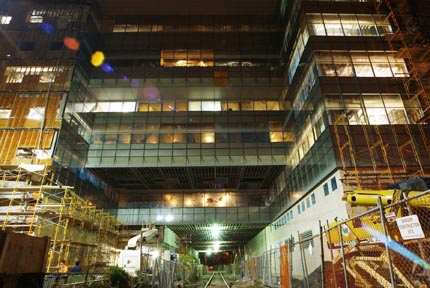 The new Brian and Cognitive Sciences building, located on the corner of Main Street and Vassar Street, spans the railroad tracks. The construction is on schedule for a 2005 opening.