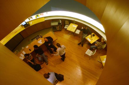 The R and D Pub, located in the Dreyfoos tower of Building 32, has an upstairs balcony overlooking the bar floor. Late night customers enjoy a drink before closing time.