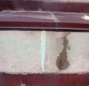 Repairs will involve sealing cracks like the one shown with polyurethane caulk and extending the copper sheets that cover the dome’s terrace steps.
