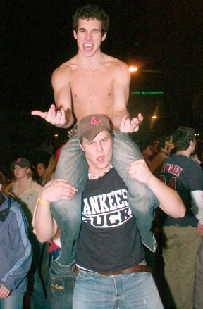 Joe Vineuilla (top) and John Piecwicz celebrate the Boston Red Sox victory over the New York Yankees Wednesday night outside of Fenway Park.