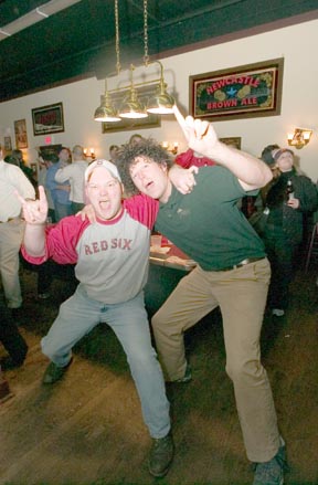 Chris Kennedy of Quincy, MA (right) celebrates the Red Sox victory over the New York Yankees with other patrons of Cornwall's Tavern in Kenmore Square.