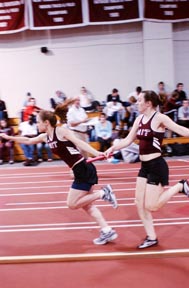 Jessica Chiafair ’05 receives the baton from Erika M. Swanson ’07 in a 4 by 800 meters relay at the MIT Coed Track and Field Invitational. MIT took 4th and 5th places in the event.