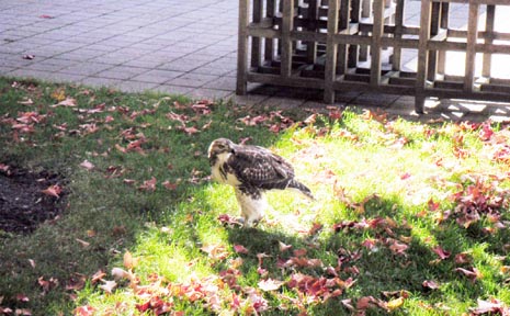 One of MIT’s resident hawks dines on a squirrel in the grass outside of of Building E52, gathering an appreciative crowd of spectators.