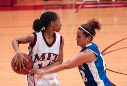 Mikala P. Streeter ’08 avoids a defender in the game against Anna Maria college last Tuesday. MIT defeated Anna Maria with a score of 65-50.
