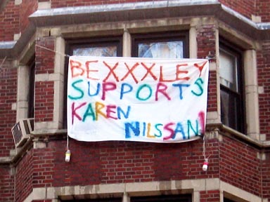 IRONY ISN’T DEAD--A banner outside Bexley Hall pokes fun at the new flag policy.