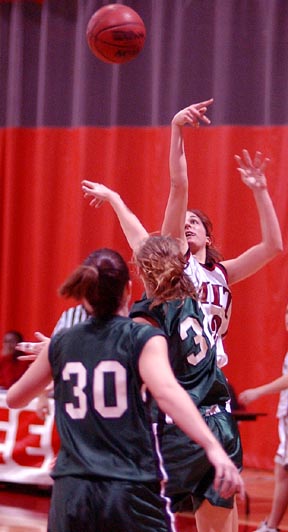 Karen A. Kinnaman ’06 leaps for control of the ball amidst traffic. After a very close first half, MIT eventually lost to the Babson Beavers 43-65.