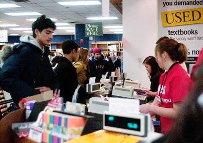 Students stand in one of three long lines at the MIT COOP in Kendall Square on Monday, Jan. 31. Many students purchased books for their classes on registration day.