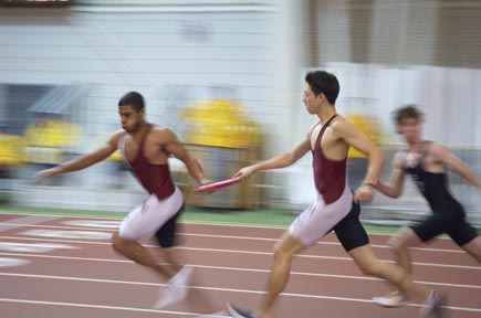 Kenneth K. Rosche ’08 hands off MIT’s baton to David A. Blau ’06 during the 4x400m relay last Saturday, Jan. 29. The MIT men’s track team attended and won a meet hosted by Bowdoin College.