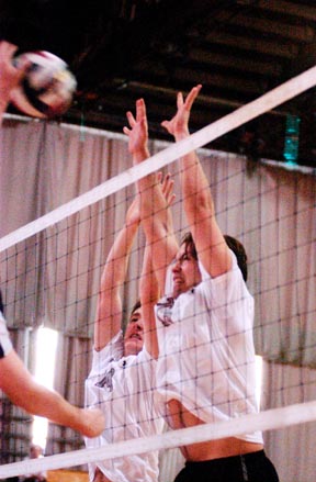 Robert G. Aspell ’06, left, and Michelangelo A. Raimondi ’06 block at the net during the first annual MIT Men’s Volleyball Invitational on Saturday, Feb. 5.