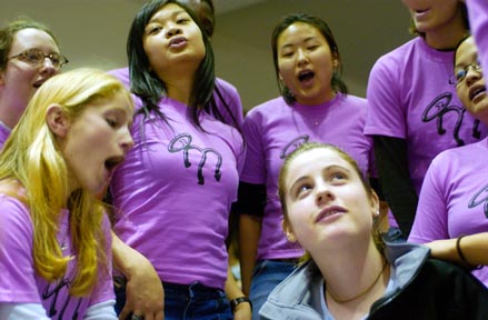 Stephanie A. Flavin ’08 is serenaded by the Muses to the song “I Touch Myself,” by The Divinyls, in Room 10-250 on Valentine’s Day.