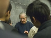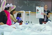 Tess E. Wise '10, Karena K. Tyan '08, and YeeKwan Lo '08, listen as Michael R. Blaisse '10 spins a children's story spoofing Professor James L. Sherley's recent hunger strike.