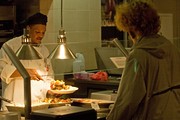 Derrick Young piles vegetables onto a plate for Richard E. Hughes '08 slightly before Pritchett Grill's closing time of 9:00 p.m. yesterday evening. Pritchett plans to offer all-you-can-eat meals throughout the remainder of spring term.