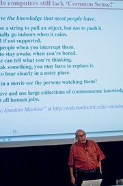 Media Arts and Sciences Professor Marvin L. Minsky presents his thoughts on future directions of artificial intelligence research to a standing-room-only crowd in the Media Lab's Bartos Theater yesterday evening. After the lecture, Minsky chatted with members of the audience and signed copies of his latest book, "The Emotion Machine."