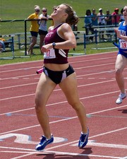 Rachel M. Niehuus '07 crosses the finish line after running the anchor leg of the women's 4x400m relay, which finished first with a time of 4:17.41. The MIT men's and women's track and field teams trained and competed in Florida over spring break.