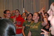 Alpha Chi Omega sisters (left to right) Gwendolyn B. Johnson ’08, Stephanie V. Brenman ’09, Meghana A. Limaye ’08, and Jessica Hickey ’07 chant at the Panhel Reaffiliation Ceremony in La Sala de Puerto Rico last Monday night.