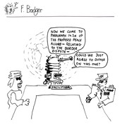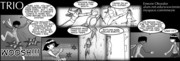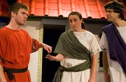 Pseudolus (Timothy I. Abrahamson ’06) reluctantly pays two Proteans (Nicole M. O’Keeffe ’09, left, and Armen Babikyan, right) money that may or may not have obtained legitimately. MTG’s production of A Funny Thing Happened on the Way to the Forum runs for the next two weekends in Kresge Little Theater.