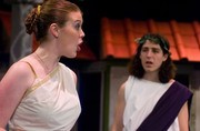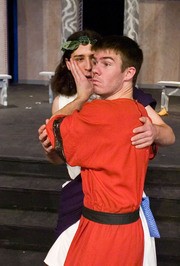 Philia (Kathleen McEnnis ’07) explains her one talent to Hero (Jonathan A. Gray ’10): being lovely. MTG’s production of A Funny Thing Happened on the Way to the Forum runs for the next two weekends in Kresge Little Theater.