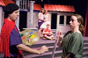 Proteans (Armen Babikyan, right, and Nicole M. O’Keeffe ’09, left) paint a pretty little picture of leads Hero, Philia, and Pseudolus. MTG’s production of A Funny Thing Happened on the Way to the Forum runs for the next two weekends in Kresge Little Theater.