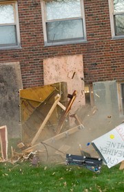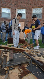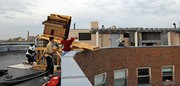 Students climb over the wreckage of the Baker House piano drop in search of salvageable parts.