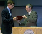 Professor Harold F. Hemond PhD '77 (left, also the photographer's father) of the Department of Civil and Environmental Engineering receives the Bose Award for Excellence in Teaching from Professor Steven R. Lerman last Wednesday evening in 10-250 during the 2007 Awards Convocation.
